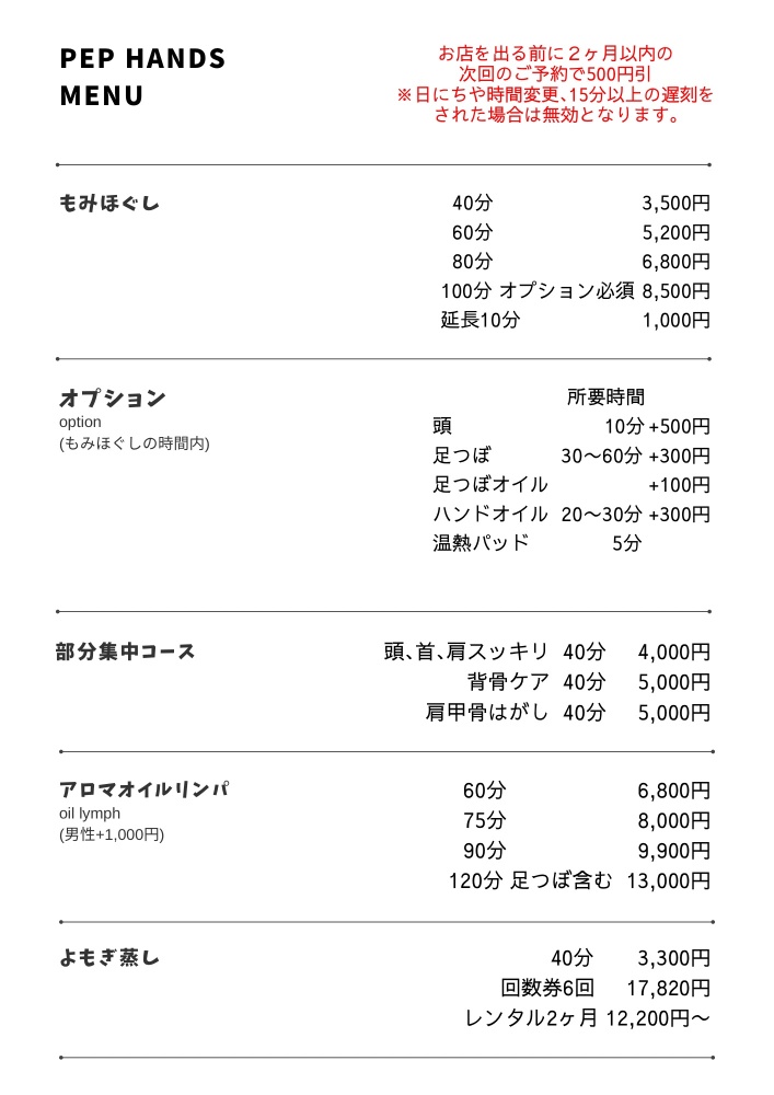 | 足つぼオイル | 30〜60分(+100円) |
